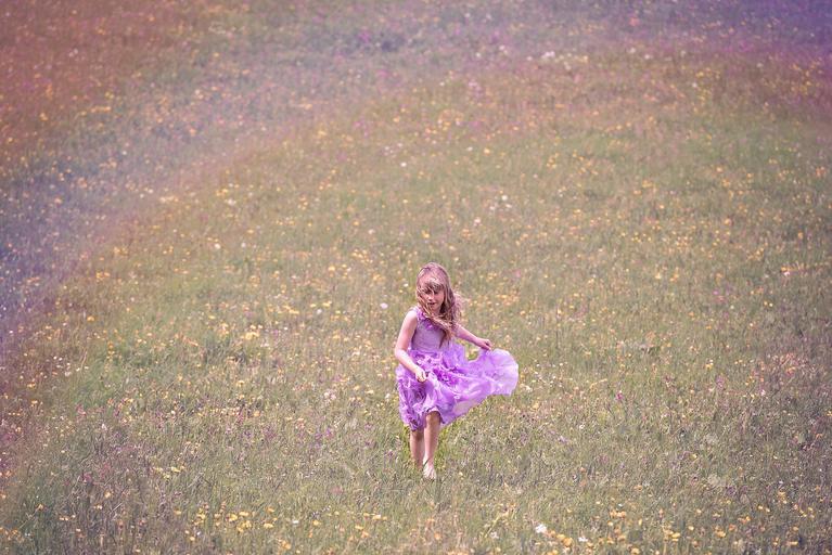Keywords: human child girl dress run meadow flower meadow rainbow