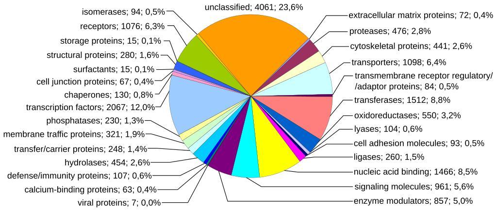 | Keywords: Human genome by functions.svg human genome categorized by function of each gene product given both as number of genes and as percentage of all genes http //www pantherdb org/chart/summary/pantherChart jsp filterLevel 1 chartType 1 listType 1 type 5 species Homo 20sapiens PANTHER Pie Chart at the PANTHER Classification System homepage Retrieved May 25 2011 https //docs google com/open id 0B8IdyPbSsy9rb0U2VFFjMm5Cd2M Diagram as an Excel file Mikael Häggström gallery of 2014 2011-05-25 thumb left Older version in png format Data at creation date 1 - Function Number of genes Percent of genome - extracellular matrix protein 72 0 40 - protease 476 2 80 - cytoskeletal protein 441 2 60 - transporter 1098 6 40 - transmembrane receptor regulatory/adaptor protein 84 0 50 - transferase 1512 8 80 - oxidoreductase 550 3 20 - lyase 104 0 60 - cell adhesion molecule 93 0 50 - ligase 260 1 50 - nucleic acid binding 1466 8 50 - signaling molecule 961 5 60 - enzyme modulator 857 5 00 - viral protein 7 0 00 - calcium-binding protein 63 0 40 - defense/immunity protein 107 0 60 - hydrolase 454 2 60 - transfer/carrier protein 248 1 40 - membrane traffic protein 321 1 90 - phosphatase 230 1 30 - transcription factor 2067 12 00 - chaperone 130 0 80 - cell junction protein 67 0 40 - surfactant 15 0 10 - structural protein 280 1 60 - storage protein 15 0 10 - receptor 1076 6 30 - isomerase 94 0 50 - unclassified 4061 23 60 - Total 17209 100 00 Cc-zero Genomics DNA sequencing Human evolution |