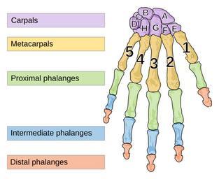 | View Original: | Human left hand bones with metacarpal numbers and carpal letters.svg (492x402) | |||