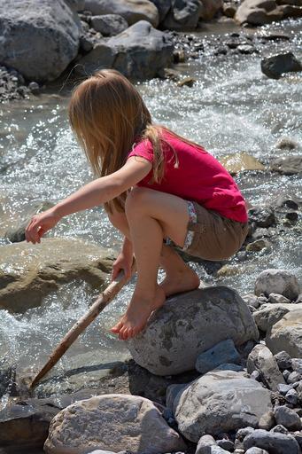 Keywords: human person child girl blond barefoot floor explore stream bed water stones nature out