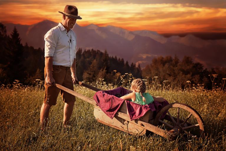 Keywords: human personal papa man child girl meadow wheelbarrows mountains in the height country life nature out sunset lighting