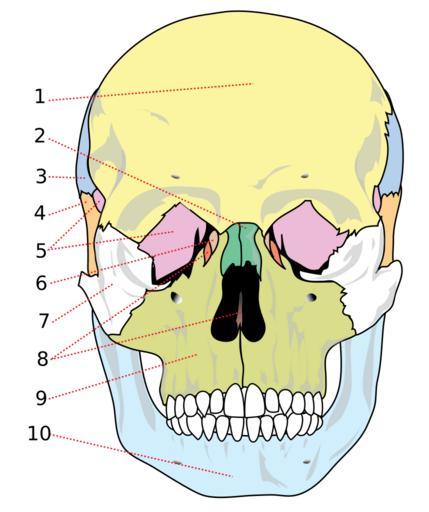 | Keywords: Human skull front bones numbered.svg numbered version of Image Human skull front bones svg made it myself 2007-01-06 LadyofHats Mariana Ruiz Villarreal <languages/> español + Skull front bones text-align right; vertical-align top Frontal bone 1 <br />Nasal bone 2 <br />Parietal bone 3 <br />Temporal bone 4 <br />Sphenoid bone 5 <br />Lacrimal bone 6 <br />Zygomatic bone 7 <br />Ethmoid bone up vomer down 8 <br />Maxilla 9 <br />Mandible 10 thumb center 150px Français + Os de la face du crâne text-align right; vertical-align top Os frontal 1 <br />Os nasal 2 <br />Os pariétal 3 <br />Os temporal 4 <br />Os sphénoïde 5 <br />Os lacrymal 6 <br />Os zygomatique 7 <br />Os éthmoïde haut vomer bas 8 <br />Maxillaire 9 <br />Mandibule 10 thumb center 150px SVG files on human skull |