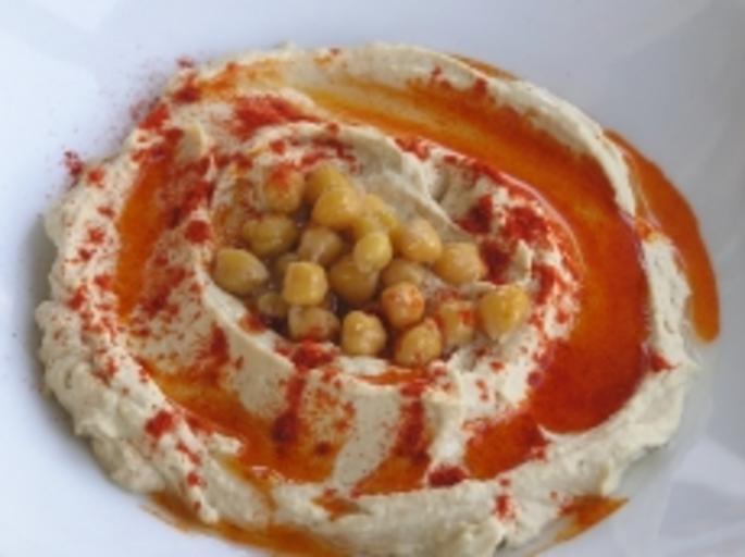 Keywords: Hummus with chickpeas 230px.jpg en a plate of hummus with chickpeas olive oil and paprika hu egy tányér hummus csicseriborsóval olívaolajjal és paprikával own Wikipedia user Databank 2009-08-12 Hummus Chickpea dishes
