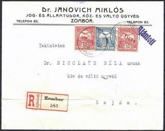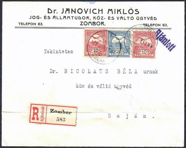 | Keywords: Hungary 1907 Cover Zombor-Bajan.jpg Zombor a city located in the province of Vojvodina Serbia to Baján Backside backside arrival postmark 'BAJA 1907 JUN 18' Franked with two red 10f and one 25f 'Turul' stamp totalling 45 filler Registration label and purple hand stamp 'AJÁNLOTT' applied The backside shows a private sealing label applied by sender 1907-06-17 Scan of original Government of Hungary Related Image 300px PD-old-100 Postmarks of Hungary Postmarks of Serbia Postal covers of Hungary Sombor |