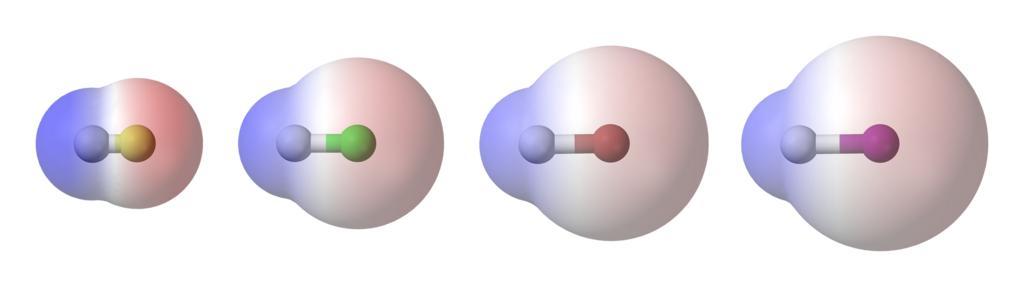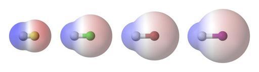 | Keywords: HX-polarity-montage-3D-balls-horizontal.png A montage of four van der Waals' surfaces coloured according to charge superimposed on a ball-and-stick models of the hydrogen halide molecules HX from the left HF HCl HBr and HI Red represents partially negatively charged regions blue represents partially positively charged regions and white represents neutral uncharged regions Created in Accelrys DS Visualizer 1 5 edited with Photoshop Elements 3 0 Own 2007-11-24 Ben Mills Benjah-bmm27 Images by Ben Mills Hydrogen halides Molecular electrical potential surfaces |