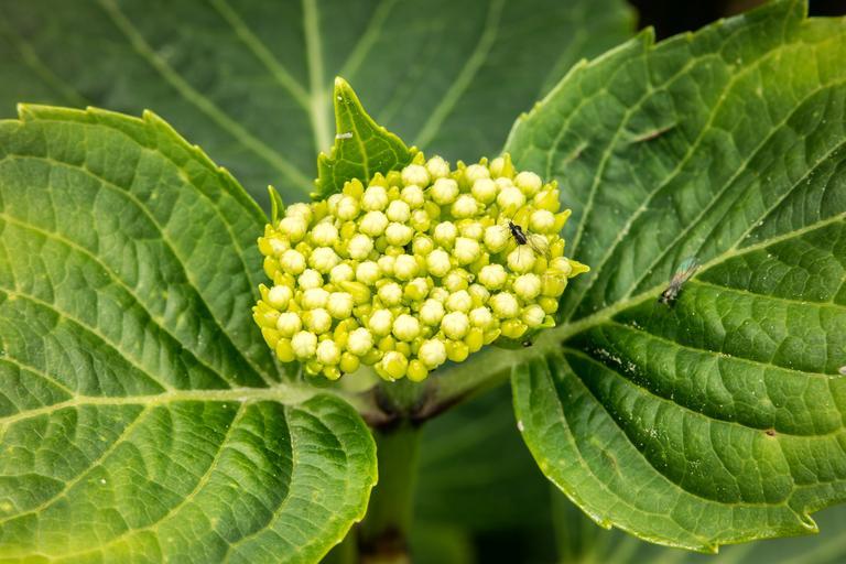 Keywords: hydrangea young blossom bloom frisch green macro fly insect leaves bud structure