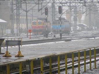 Keywords: Hž 1141 1142.JPG Hrvatske željeznice 1142 series besides a 1141 series on a cloudy and snowy day Own 2007-11-16 Phantom25 Public domain 50px Electric locomotives of Croatia