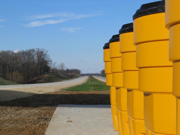 | Keywords: i-69 i69 interstate 69 interstate69 indiana greene county greenecounty road construction interstate freeway bridge infrastructure fitch barrier fitchbarrier fitch barrels fitchbarrels barrels milestone contractors milestonecontractors Fitch Barriers lined up in front of the median bridge pier of the overpass carrying Hobbieville Road over Interstate 69 in Greene County, Indiana; looking north. These familiar and common barrels, named after the man who devised them, race car driver John Fitch, form a simple yet effective system to reduce the severity of crashes. Filled with sand in increasing gradations, the barrels help slow a vehicle on impact, and lessen a potential violent collision with a solid obstruction, such as a bridge abutment or column. The barriers are inexpensive and have saved thousands of lives since their implementation in the late 1960s. Milestone Contractors, prime contractor (Indiana I-69 Corridor Project, Section 4, Segments 4/5/6a). Fitch Barriers lined up in front of the median bridge pier of the overpass carrying Hobbieville Road over Interstate 69 in Greene County, Indiana; looking north. These familiar and common barrels, named after the man who devised them, race car driver John Fitch, form a simple yet effective system to reduce the severity of crashes. Filled with sand in increasing gradations, the barrels help slow a vehicle on impact, and lessen a potential violent collision with a solid obstruction, such as a bridge abutment or column. The barriers are inexpensive and have saved thousands of lives since their implementation in the late 1960s. Milestone Contractors, prime contractor (Indiana I-69 Corridor Project, Section 4, Segments 4/5/6a). |