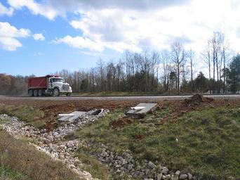 Keywords: i-69 i69 interstate 69 interstate69 indiana monroe county monroecounty road interstate construction freeway paving infrastructure e. s. wagner co. eswagnerco riprap drainage pvc piping pvcpiping A Mack tri-axle dump truck transports a load of riprap (large, bucket-sized rocks) to an Interstate 69 construction zone near Rockport Road in Monroe County, Indiana; looking southeast from near Lodge Road. In the foreground are ravines lined with riprap to ensure proper drainage from the road and nearby embankments. The three drainage outlets pictured each drain water from different parts of the road. The large middle outlet drains water from the median, while the two PVC piping outlets with concrete headwalls serve to drain water from the road's subbase. Completing construction, the PVC pipes will be cut flush to the headwalls and animal guards inserted in the tubes. E. S. Wagner Co., prime contractor (Indiana I-69 Project, Section 4, Segment 8). A Mack tri-axle dump truck transports a load of riprap (large, bucket-sized rocks) to an Interstate 69 construction zone near Rockport Road in Monroe County, Indiana; looking southeast from near Lodge Road. In the foreground are ravines lined with riprap to ensure proper drainage from the road and nearby embankments. The three drainage outlets pictured each drain water from different parts of the road. The large middle outlet drains water from the median, while the two PVC piping outlets with concrete headwalls serve to drain water from the road's subbase. Completing construction, the PVC pipes will be cut flush to the headwalls and animal guards inserted in the tubes. E. S. Wagner Co., prime contractor (Indiana I-69 Project, Section 4, Segment 8).