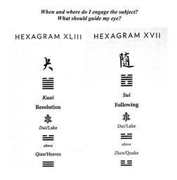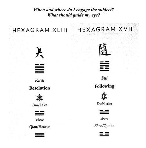 Keywords: With “heads” = 3, and “tails” = 2, three coins were thrown six times: _____2+2+3 = 7, Undivided Line (Young, or Unchanging, Yang) _____3+3+3 = 9, Undivided Line (Old, or Changing, Yang) _____3+3+3 = 9, Undivided Line (Old, or Changing, Yang) _____2+2+3 = 7, Undivided Line (Young, or Unchanging, Yang) _____2+2+3 = 7, Undivided Line (Young, or Unchanging, Yang) _____3+3+2 = 8, Divided Line (Young, or Unchanging, Yin) Building up from the bottom space, this yields the trigram 7/9/9 (Qian/Heaven transforming into Zhen/Quake) under the trigram 7/7/8 (Dui/Lake), and the resultant two hexagrams, displayed above. Chinese renderings from the translation by John Minford. |