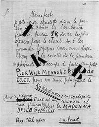 | Keywords: I.K. Bonset Manifeste IKB.jpg  ink paper cm 27 4 21 3 Bibliothèque littéraire Jacques-Doucet 1921 1 black and white image object history - 1921 1963 Tristan Tzara 1896-1963 Paris ProvenanceEvent 1963 inheritance Christophe Tzara Tristan Tzara Paris ProvenanceEvent 1967 acquisition LangSwitch the la de Bibliothèque littéraire Jacques-Doucet Paris Christophe Tzara exhibition history Van Doesburg and the International Avant-Garde 256 London ˜I K Bonset Theo van Doesburg I K B Manifesto Dadaglobe 1921 Handwritten manuscript ™ credit line accession number BLJD cote TZR 783 43 Marco Entrop 1988 ˜ ˜Je suis contre tout et tous ™ I K Bonset en Tristan Tzara's Dadaglobe ™ Jong Holland Tweemaandelijks tijdschrift voor moderne kunst en vormgeving vol 4 no 4 p 29 PD-old I K Bonset Manuscripts by Theo van Doesburg Bibliothèque littéraire Jacques-Doucet Dadaglobe |