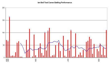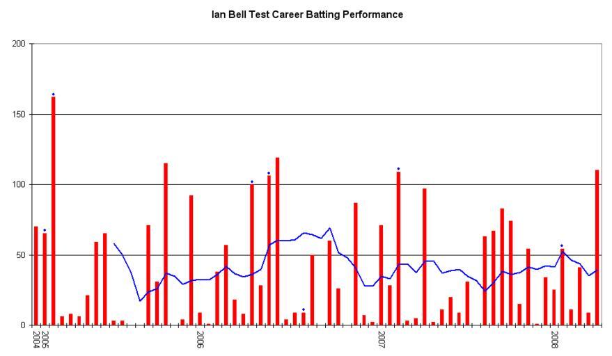 | Keywords: Ian Bell graph.png Test Match performance of Ian Bell It was created by Raven4x4x The red bars indicate the player's test match innings while the blue line shows the average of the ten most recent innings at that point Note that this average cannot be calculated for the first nine innings The blue dots indicate innings in which Bell finished not-out This graph was generated with Microsoft Excel 2002 using data from Cricinfo http //stats cricinfo com/statsguru/engine/player/9062 html class 1;orderby start;template results;type batting;view innings and Howstat http //www howstat com au/cricket/Statistics/Players/PlayerProgressBat asp PlayerID 3207 The information in this graph is current as of 30 March 2008 2007-12-30 Own <br />Transferred from http //en wikipedia org en wikipedia Raven4x4x at http //en wikipedia org en wikipedia en wikipedia Raven4x4x original upload log page en wikipedia Ian_Bell_graph png 2007-12-30 06 28 Raven4x4x 986×574 4717 bytes <nowiki>This graph details the Test Match performance of Ian Bell It was created by Raven4x4x The red bars indicate the player's test match innings while the blue line shows the ave</nowiki> 2008-03-30 06 23 en user Raven4x4x Raven4x4x 986×574 4849 bytes <nowiki>Updated The information in this graph is current as of 30 March 2008 </nowiki> DEFAULTSORT Bell Ian Ian Bell cricketer Wisden Cricket graphs |