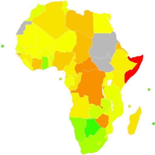 Keywords: Ibrahim-index-of-african-governance-rule-of-law.svg Editor note This map is saved in human-editable plain text format Please do not upload edits saved with Inkscape or similar editors Ibrahim Index of African Governance legend 00ff00 100 80ff00 75 ffff00 50 ff8000 25 ff0000 0 e0e0e0 no data A country with a score X between 0 and 50 is coloured rgb 255 255X/50 0 A country with a score X between 50 and 100 is coloured rgb 255 100-X /50 255 0 This leads to a country with score of 0 being coloured red a country with a score of 50 being coloured yellow and a country with a score of 100 being coloured green The source data from the 2013 report can be found here http //www moibrahimfoundation org/interact/ srl;root Feel free to update this map as new data become available but please retain the current liberal licensing terms Based on File BlankMap-Africa svg Stephen Morley 2010-07-25 <gallery>File Ibrahim-index-of-african-governance svg Overall scores on the Ibrahim Index of African Governance</gallery> cc-zero Demographic maps
