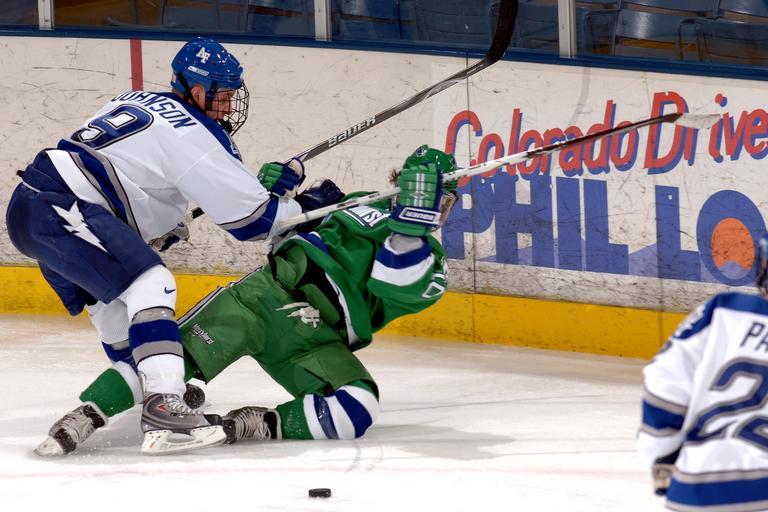 Keywords: ice hockey players contact sticks goal puck athlete competition game teams sport rink arena forward playing skating skate action