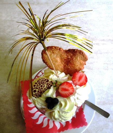 Keywords: ice ice cream sundae enjoy strawberries whipped cream cream biscuit decoration
