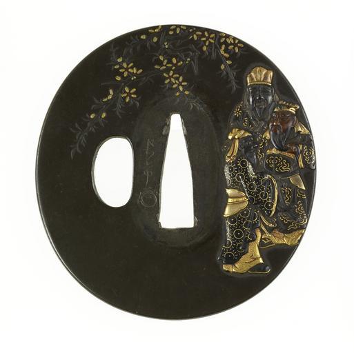 Keywords: Ichinomiya Nagatsune - Tsuba with the Elegant Gathering in a Peach Orchard - Walters 51109.jpg This tsuba shows the Chinese figures Genroku Ch Liu Bei Kanyu Ch Guan Yu and Chôhi Ch Zhang Fei in the peach orchard where they took an oath of brotherhood The episode takes place in the 14th-century novel Romance of the Three Kingdoms which tells a fictionalized account of events in the 2nd century during the Three Kingdoms period All three men led soldiers in victorious battle and Genroku became emperor of China The back depicts cloths hung to create an enclosure for a picnic in the orchard between 1732 1787 Edo shibuichi with gold and copper details cm 7 28 7 08 0 42 accession number 51 109 27108 Henry Walters Baltimore date and mode of acquisition unknown Walters Art Museum Henry Walters Acquired by Henry Walters Signature Nagatsune place of origin Kyoto Japan Walters Art Museum license Tsuba in the Walters Art Museum Ichinomiya Nagatsune Media contributed by the Walters Art Museum needs category review Oath of the peach garden |