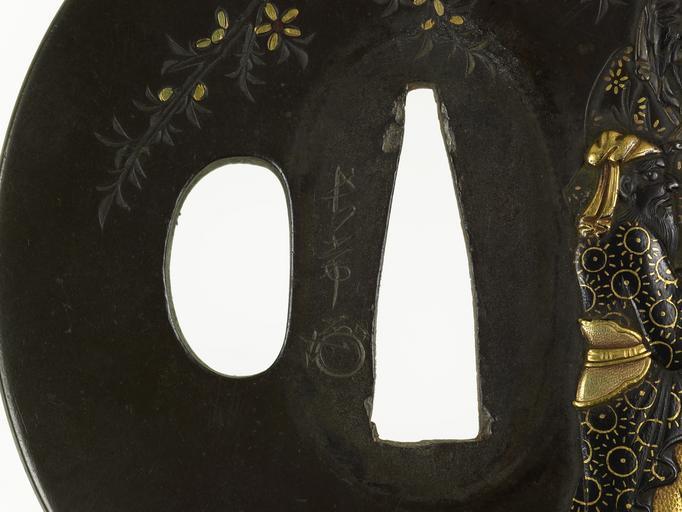 Keywords: Ichinomiya Nagatsune - Tsuba with the Elegant Gathering in a Peach Orchard - Walters 51109 - Mark A.jpg This tsuba shows the Chinese figures Genroku Ch Liu Bei Kanyu Ch Guan Yu and Chôhi Ch Zhang Fei in the peach orchard where they took an oath of brotherhood The episode takes place in the 14th-century novel Romance of the Three Kingdoms which tells a fictionalized account of events in the 2nd century during the Three Kingdoms period All three men led soldiers in victorious battle and Genroku became emperor of China The back depicts cloths hung to create an enclosure for a picnic in the orchard between 1732 1787 Edo shibuichi with gold and copper details cm 7 28 7 08 0 42 accession number 51 109 27108 Henry Walters Baltimore date and mode of acquisition unknown Walters Art Museum Henry Walters Acquired by Henry Walters Signature Nagatsune place of origin Kyoto Japan Walters Art Museum license Tsuba in the Walters Art Museum Ichinomiya Nagatsune Media contributed by the Walters Art Museum needs category review Oath of the peach garden |