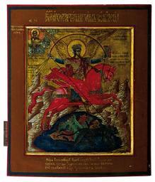| Keywords: Icon of saint Michael horseman (Russia, c. 1900, priv. coll.).jpg St Michael Horseman of the Apocalypse Egg tempera on wood panel with kovcheg Crowned with prominent outstretched wings astride a fiery winged horse the archangel blowing a golden trumpet raising a Book of Gospels and his lance with cruciform finial Christ appearing in swirling clouds in the upper left corner Guslitsa circa 1900 31 x 26 5 cm Guslicy um 1900 http //www auctions-fischer de/catalogues/online-catalogues/207-i-russian-greek-icons html L 1 kategorie 93 artikel 24619 L 1 cHash 128089727d 19 c anonymous Private collections of Russian art Files uploaded by Shakko from various sources PD-Art 19th-century icons of Russia Icons of Saint Michael horseman |