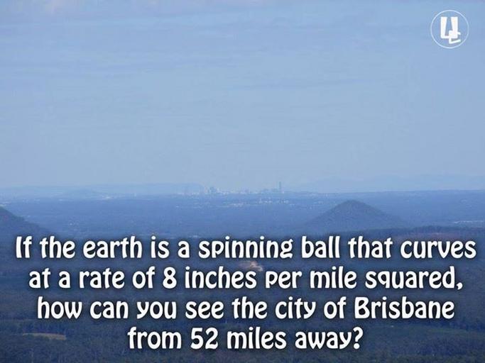 Keywords: brisbane 52 miles 8 inches squared nasa news flatearth flat earth space hoax sun moon yin yang yinyang god reality plane universe curve curvature nocurve bible truth dome outdoor If the earth is a spinning ball that curves at a rate of 8 inches per miles squared, how can you see the city of Brisbane from 52 miles away? FlatEarth meme collected by A.J. Wilson of iPressThis at FlatEarth.Online, made by others. If the earth is a spinning ball that curves at a rate of 8 inches per miles squared, how can you see the city of Brisbane from 52 miles away? FlatEarth meme collected by A.J. Wilson of iPressThis at FlatEarth.Online, made by others. |