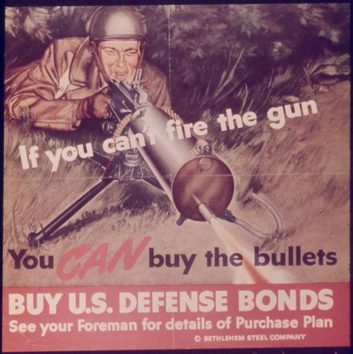 Keywords: "If You Can't Fire The Gun You Can Buy The Bullets" - NARA - 514586.jpg Scope and content General notes 514586 Local identifier 44-PA-1062 Office for Emergency Management Office of War Information Domestic Operations Branch Bureau of Special Services 03/09/1943 - 09/15/1945 Still Picture Records Section Special Media Archives Services Division NWCS-S National Archives at College Park 8601 Adelphi Road College Park MD 20740-6001 1941 - 1945 Record group Record Group 44 Records of the Office of Government Reports 1932 - 1947 Record group ARC 373 World War II Posters compiled 1942 - 1945 Series ARC 513498 File unit File unit ARC Variant control numbers NAIL Control Number NWDNS-44-PA-1062 Other versions <gallery> File If_You_Can't_Fire_The_Gun_You_Can_Buy_The_Bullets _-_NARA_-_514586 tif tif File If_You_Can't_Fire_The_Gun_You_Can_Buy_The_Bullets _-_NARA_-_514586 jpg jpg </gallery> NARA-cooperation PD-USGov World War II war bond posters from the United States Machine guns of the United States Bethlehem Steel Soldiers in World War II propaganda of the United States