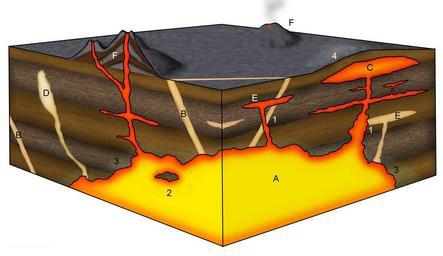 Keywords: Igneous structures.jpg en Schematic overview of plutonic subvolcanic and volcanic structures/rock bodies and accompanied processes and phenomena Structures A active magma chamber called pluton when cooled and entirely crystallized; a batholith is a large rock body composed of several plutonic intrusions B old magmatic dykes/dikes C emerging laccolith D old pegmatite late-magmatic dyke formed by aggressive and highly mobile residual melts of a magma chamber E old and emerging magmatic sills F stratovolcano Accompanied processes and phenomena 1 young emerging subvolcanic intrusion cutting through older one 2 xenolith solid rock of high melting temperature which has been transported within the magma from deep below or roof pendant fragment of the roof of the magma chamber that has detached from the roof and sunk into the melt 3 contact metamorphism in the country rock adjacent to the magma chamber caused by the heat of the magma 4 uplift at the surface due to laccolith emplacement in the near subground de Schematische à bersicht plutonischer subvulkanischer und vulkanischer Strukturen/Gesteinskörper und begleitender Prozesse und Erscheinungen Strukturen A aktive Magmakammer als Pluton bezeichnet wenn abgekühlt und komplett auskristallisiert; ein sehr großer komplex aufgebauter Pluton wird auch Batholith genannt B alte magmatische Gänge C entstehender Lakkolith D alter Pegmatitgang spätmagmatische Bildung aggressiver und hochmobiler Restschmelzen eines Plutons E alte und entstehende magmatische Lagergänge F Schichtvulkan Begleitende Prozesse und Erscheinungen 1 junge entstehende subvulkanische Intrusion durchschneidet/kreuzt eine ältere 2 Xenolith festes Gestein mit hohem Schmezpunkt das innerhalb des Magmas aus großer Tiefe transportiert wurde oder Pendant des Daches der Magakammer Fragment des Daches der Magmakammer das sich abgelöst hat und in das Magma eingesunken ist; man beachte dass das Dach der Magmakammer aus Nebengestein besteht während der sogenannte Dachbereich des abgekühlten Plutons den obersten Teil des eigentlichen magmatischen Gesteinskörpers bezeichnet 3 Kontaktmetamorphose im unmittelbar an die Magmakammer angrenzenden Nebengestein ausgelöst durch die Wärme des Magmas 4 Hebungsvorgang an der Erdoberfläche infolge der Platznahme eines Lakkolithes im nahen Untergrund own 2007-03 user Woudloper Please report to me when errors or inconsistencies are found Volcanological diagrams Block diagrams cartography Igneous rocks Magmatic systems |
