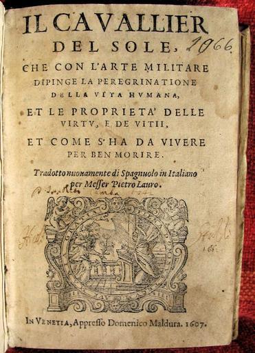 | Keywords: Il cavallier del sole.jpg en Title page of the Il cavallier del sole 1607 italian edition of the El caballero del sol es Página de título de la edición italiana de 1607 de El caballero del sol Il cavallier del sole 1607 Photo from an old book Hernández de Villaumbrales; Moldura other versions PD-old-100-1923 Uploaded with UploadWizard Old books 1607 books 1607 in Italy Pedro Hernández de Villaumbrales | ||||