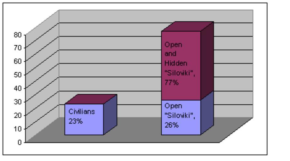 Keywords: IllarionovBureaucratSilovikiPercentage.PNG Professional affiliations of the government workers in modern Russia according to en Andrey Illarionov own 2007-05-08 Alex Bakharev based on slide 7 from http //www iea ru/article/corp_country/12_04_07_1 ppt Illarionov presentations