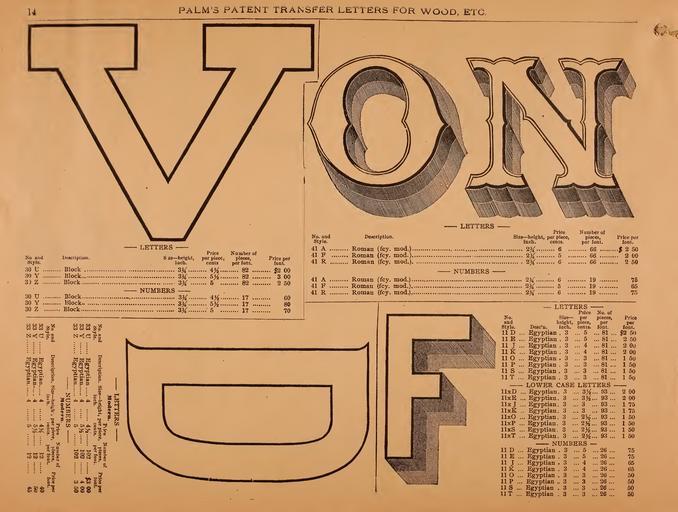 MAKE A MEME View Large Image Public Domain Book:Illustrated sample book & price list of Palm's patent transfer letters ornaments & trade designs for signs, wagons, cars, machines, etc manufactured by the Palm Letter Co Published 1901 in Cincinnati . ...
