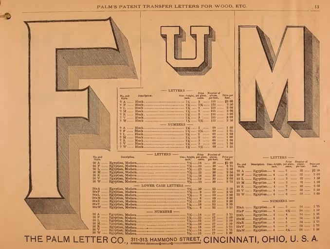 MAKE A MEME View Large Image Public Domain Book:Illustrated sample book & price list of Palm's patent transfer letters ornaments & trade designs for signs, wagons, cars, machines, etc manufactured by the Palm Letter Co Published 1901 in Cincinnati . ...