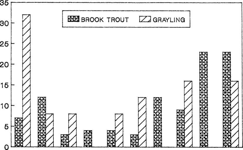 | Keywords: bookid:3b14a17e-a59d-43fb-b7c1-689fe4f8170f bookid3b14a17ea59d43fbb7c1689fe4f8170f bookyear:1990 bookyear1990 bookdecade:1990 bookdecade1990 bookcentury:1900 bookcentury1900 bookauthor:mcmichael_geoffrey_a bookauthormcmichaelgeoffreya bookauthor:montana_natural_heritage_program bookauthormontananaturalheritageprogram bookauthor:beaverhead_deerlodge_national_forest_agency_u_s_ bookauthorbeaverheaddeerlodgenationalforestagencyus bookauthor:united_states_bureau_of_land_management_butte_district bookauthorunitedstatesbureauoflandmanagementbuttedistrict bookauthor:montana_dept_of_fish_wildlife_and_parks bookauthormontanadeptoffishwildlifeandparks bookauthor:montana_cooperative_fisheries_research_unit bookauthormontanacooperativefisheriesresearchunit booksubject:arctic_grayling booksubjectarcticgrayling booksubject:fish_populations booksubjectfishpopulations booksubject:fishes booksubjectfishes bookpublisher:helena_mont_montana_natural_heritage_program bookpublisherhelenamontmontananaturalheritageprogram bookcontributor:montana_state_library bookcontributormontanastatelibrary bookleafnumber:41 bookleafnumber41 bookcollection:montanastatelibrary bookcollectionmontanastatelibrary bookcollection:americana bookcollectionamericana bhl collection bhlcollection blackandwhite monochrome text white background photo border bookid:7b89fe86-7752-4269-b518-48161a3c58f3 bookid7b89fe8677524269b51848161a3c58f3 bookyear:1990 bookyear1990 bookdecade:1990 bookdecade1990 bookcentury:1900 bookcentury1900 bookauthor:streu_jon_m bookauthorstreujonm bookauthor:montana_natural_heritage_program bookauthormontananaturalheritageprogram bookauthor:beaverhead_deerlodge_national_forest_agency_u_s_ bookauthorbeaverheaddeerlodgenationalforestagencyus bookauthor:montana_dept_of_fish_wildlife_and_parks bookauthormontanadeptoffishwildlifeandparks bookauthor:montana_cooperative_fisheries_research_unit bookauthormontanacooperativefisheriesresearchunit booksubject:arctic_grayling booksubjectarcticgrayling booksubject:fish_populations booksubjectfishpopulations booksubject:fishes booksubjectfishes bookpublisher:helena_mont_montana_natural_heritage_program bookpublisherhelenamontmontananaturalheritageprogram bookcontributor:montana_state_library bookcontributormontanastatelibrary bookleafnumber:41 bookleafnumber41 bookcollection:montanastatelibrary bookcollectionmontanastatelibrary bookcollection:americana bookcollectionamericana bhl collection bhlcollection blackandwhite monochrome text white background photo border black and white Title: Distribution, relative abundance and habitat utilization of the arctic grayling (Thymallus arcticus) in the Upper Big Hole River Drainage, Montana, June 21 to August 28, 1989 : final report Identifier: 3B14A17E-A59D-43FB-B7C1-689FE4F8170F Year: 1990 (1990s) Authors: McMichael, Geoffrey A; Montana Natural Heritage Program; Beaverhead-Deerlodge National Forest (Agency : U. S. ); United States. Bureau of Land Management. Butte District; Montana. Dept. of Fish, Wildlife, and Parks; Montana Cooperative Fisheries Research Unit Subjects: Arctic grayling; Fish populations; Fishes Publisher: Helena, Mont. : Montana Natural Heritage Program Contributing Library: Montana State Library View Book Page: Book Viewer About This Book: Catalog Entry View All Images: All Images From Book Click here to view book online to see this illustration in context in a browseable online version of this book. Text Appearing Before Image: p E R C E N T O F V O I U M Text Appearing After Image: MAY CAD STN SCUD AQBTL TER LCH WRM FSH FOOD ITEM CRN Figure 14. Percent volume of stomach contents of 6 to 10 inch Arctic grayling and brook trout from the Big Hole River and its tributaries made up of various food items. MAY=Mayfly, CAD= Caddisfly, STN=Stonefly, SCUD=Amphipod Crustacean, AQBTL=Aquatic Beetle, TER=Terrestrial Insect, LCH=Leech, WRM=Worm, FSH=Fish, CRN=Cranefly 36 Note About Images Please note that these images are extracted from scanned page images that may have been digitally enhanced for readability - coloration and appearance of these illustrations may not perfectly resemble the original work. Title: Distribution, relative abundance and habitat utilization of the arctic grayling (Thymallus arcticus) in the Upper Big Hole River Drainage, Montana, June 21 to August 28, 1989 : final report Identifier: 3B14A17E-A59D-43FB-B7C1-689FE4F8170F Year: 1990 (1990s) Authors: McMichael, Geoffrey A; Montana Natural Heritage Program; Beaverhead-Deerlodge National Forest (Agency : U. S. ); United States. Bureau of Land Management. Butte District; Montana. Dept. of Fish, Wildlife, and Parks; Montana Cooperative Fisheries Research Unit Subjects: Arctic grayling; Fish populations; Fishes Publisher: Helena, Mont. : Montana Natural Heritage Program Contributing Library: Montana State Library View Book Page: Book Viewer About This Book: Catalog Entry View All Images: All Images From Book Click here to view book online to see this illustration in context in a browseable online version of this book. Text Appearing Before Image: p E R C E N T O F V O I U M Text Appearing After Image: MAY CAD STN SCUD AQBTL TER LCH WRM FSH FOOD ITEM CRN Figure 14. Percent volume of stomach contents of 6 to 10 inch Arctic grayling and brook trout from the Big Hole River and its tributaries made up of various food items. MAY=Mayfly, CAD= Caddisfly, STN=Stonefly, SCUD=Amphipod Crustacean, AQBTL=Aquatic Beetle, TER=Terrestrial Insect, LCH=Leech, WRM=Worm, FSH=Fish, CRN=Cranefly 36 Note About Images Please note that these images are extracted from scanned page images that may have been digitally enhanced for readability - coloration and appearance of these illustrations may not perfectly resemble the original work. Title: Select aspects of the life history and ecology of the Montana arctic grayling (Thymallus arcticus montanus) [Milner] in the Upper Big Hole River drainage, Montana, June 15 to August 31, 1990 : final report Identifier: 7B89FE86-7752-4269-B5