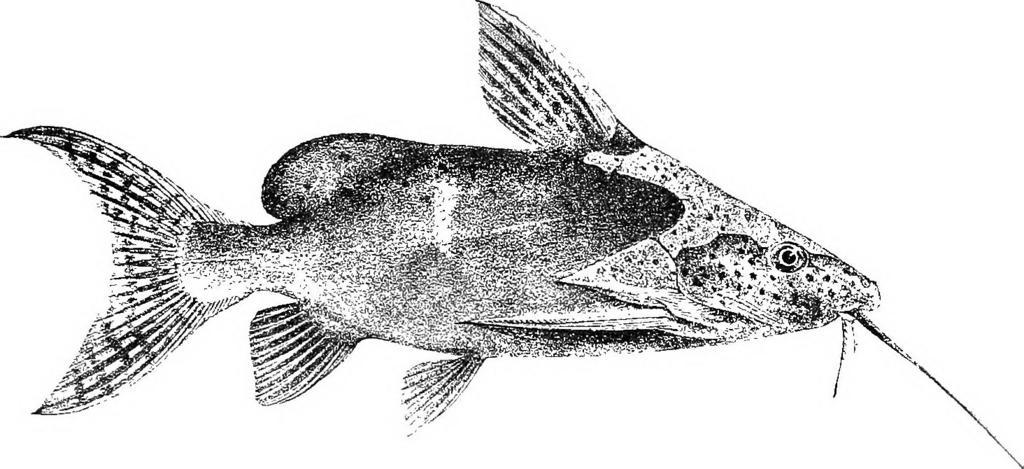 <em>Synodontis nigrita. times. Head a little longer than bread, rugose, granulate above from between the eyes ; snout rounded, as long as postocular part of head : eye superolateral, 4 to 5-j times in length of head, H to '2\ times in interorbital width; lips moderately developed; prsemaxillary teeth forming a short and broad band; movable mandibular teeth not more than ^ diameter of eye, 30 to 35 in number. Maxillary barbel with a broad marginal membrane in its basal third, 1 to ]§ times length of head, reaching between anterior and posterior fourth of pectoral spine ; cuter mandibular barbel about twice as long as inner, both with short,</em>