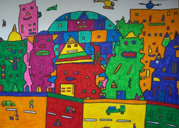Keywords: image painted colorful color james rizzi inspired student work felt tip pens
