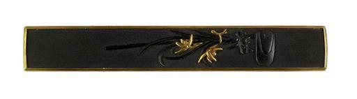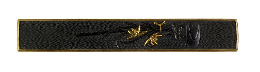 Keywords: Imai Nagatake - Kozuka with a Spade and Orchids - Walters 51720.jpg Two orchids and leaves are tied to a spade The background is a fish egg pattern nanakoji with a raised rim The artist signed the kozuka on the reverse between 1818 1882 late Edo-Meiji shakudo gold silver copper cm 9 6 accession number 51 720 39185 Henry Walters Baltimore date and mode of acquisition unknown Walters Art Museum Henry Walters Acquired by Henry Walters Signature Heianjô Imai Nagatake; Number On sticker edged with a blue trellis pattern 378 place of origin Kyoto Japan Walters Art Museum license Kozuka in the Walters Art Museum Imai Nagatake Media contributed by the Walters Art Museum needs category review |