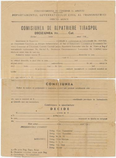 Keywords: Оборотная сторона фронтовых документов, выданных в г. Одессе в 1944 г..jpg ru Обо отная сто она ф онтовых документов выданных инжене -капитану Ту баевскому К И в г Одессе 24 августа 1944 года пе ед десантом в Жеб ияны Вилково Для экономии бумаги документы иногда писались на официальных бланках Т анснист ии Это бланк документа на получение финансовых с едств для епат иантов из Румынии пе еселяемых на Ук аину ro În Al Doilea Război Mondial documente militare sovietice au fost uneori scrise pe spatele unor formulare oficiale ale administrației române din Transnistria 1944 uk Зво отній бік ф онтових документів що були видані інжене -капітану Ту баєвському К І в Одесі 24 се пня 1944 оку пе ед десантом в Жеб іяни Вилкове Для економії папе у документи іноді писалися на офіційних бланках Т ансніст ії Це бланк документа на от имання фінансових коштів для епат іантів з Румунії що пе еїжджають на Ук аїну thumb left Лицевая сто она ф онтовой документ коменданту го Жеб ияны от 24 августа 1944 г thumb Лицевая сто она удостове ение инжене -капитана Ту баевского К И от 24 августа 1944 г 1944-08-24 <small><sub>chelo</sub></small>Vechek / <small><sup>talk</sup></small> с о игинала из собственного а хива <small><sub>chelo</sub></small>Vechek / <small><sup>talk</sup></small> from original in own archive <small><sub>chelo</sub></small>Vechek / <small><sup>talk</sup></small> de l'original en propre archive ru е указывается en Not credited 46 466667 30 733333 PD-heirs PD-trivial 1944-08-24 Documents of the Soviet Union 1944 Romania in World War II 1944 in Romania