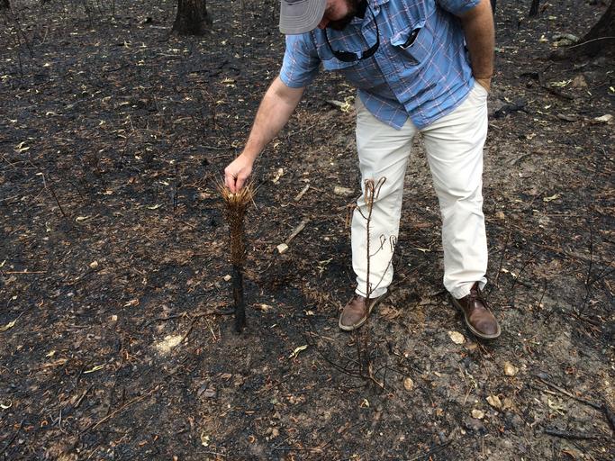 Keywords: outdoor A longleaf pine sapling that survived a recent burn next to a loblolly pine sapling that did not. A longleaf pine sapling that survived a recent burn next to a loblolly pine sapling that did not.