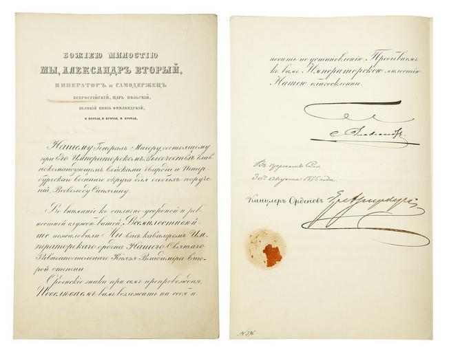| Keywords: Наградной документ на Всеволода Сипягина.jpg en Award document awarding Vsevolod Sipyagin Order of St Vladimir 2nd degree ru аг адной документ о наг аждении Всеволода Сипягина о деном Святого Владими а 2-й степени http //www auction-imperia ru/wdate php t offline i 4537 Импе ато Александ II 30 августа 1875 года PD-RusEmpire Order of St Vladimir |