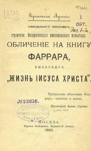 | View Original: | Арсений, иеромонах. Обличение на книгу Фаррара, именуемую „Жизнь Иисуса Христа“ (title pagе).jpg (456x750) | |||
