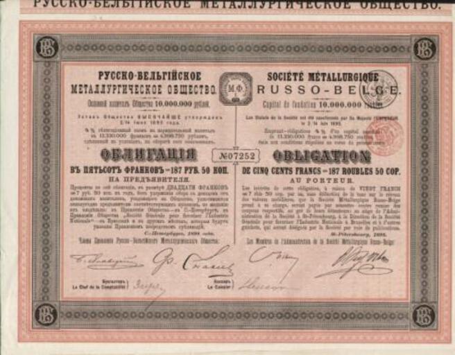View Original:Русско-бельгийское металлургическое общество. Облигация в 187 рублей 50 копеек.jpg (500x390)