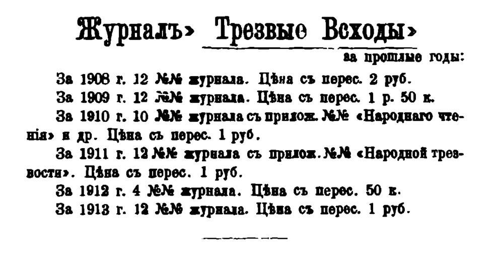 | Keywords: Журнал «Трезвые всходы». Количество номеров за 1908—1913 гг.png Объявление об отк ытии на 1914 г подписки на ежемесячный лите ату ный жу нал «Т езвые всходы» File Блудо ов П Систематический указатель книг и пособий по алкоголизму 1914 pdf Блудо ов П PD-RusEmpire Trezvyye vskhody Images uploaded by Steven Pavlov from various sources Magazines of Russia unidentified year | ||||