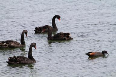 Keywords: outdoor bird animal waterfowl aquatic bird Black Swan: Mostly black with a line of white flight feathers along the wing edges, sometimes showing when at rest, and noticeable in flight; bill bright red, with a pale bar and tip; legs and feet greyish-black; makes a bugle-like sound, musical and far reaching, as well as a range of softer crooning notes. Paradise Duck (Tadorna variegata) (Putangitangi) This duck is endemic to New Zealand. It was discovered first by Captain Cook at Dusky Sound in 1773 during his second voyage. Cook called it the Painted Duck. They were not a common bird before settlement by Europeans but are now one of the endemic birds which has prospered with the conversion of native forest to pasture. Black Swan: Mostly black with a line of white flight feathers along the wing edges, sometimes showing when at rest, and noticeable in flight; bill bright red, with a pale bar and tip; legs and feet greyish-black; makes a bugle-like sound, musical and far reaching, as well as a range of softer crooning notes. Paradise Duck (Tadorna variegata) (Putangitangi) This duck is endemic to New Zealand. It was discovered first by Captain Cook at Dusky Sound in 1773 during his second voyage. Cook called it the Painted Duck. They were not a common bird before settlement by Europeans but are now one of the endemic birds which has prospered with the conversion of native forest to pasture. |