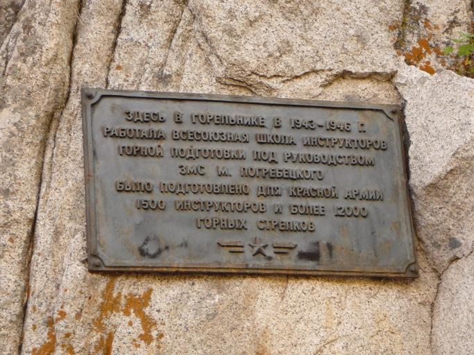 | Keywords: Памятная Доска.JPG ru Памятная доска в у очище Го ельник в 20 километ ах южнее Алма-Аты где в 1943-1946 годах существовала Всесоюзная школа инст укто ов го ност елковой подготовки Собственный фотоа хив Kalabaha1969 5 07 2009 Cc-zero Army of the Soviet Union Mountaineering in the Soviet Union |