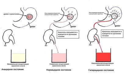 | Keywords: Схема проведения ацидотеста.jpg ru а исунке отоб ажен п инцип п оведения ацидотеста П инцип методики заключается в том что к аситель кото ым насыщены ионообменные смолы вытесняется ионами водо ода в кислой с еде желудка Далее к аситель всасывается в толстой кишке и выделяется с мочой Соответственно интенсивность ок ашивания мочи позволяет о иенти овочно судить о кислотности желудочного сока Анацидное состояние - ионы водо ода в желудочном соке почти отсутствуют соответственно к аситель п актически не вытесняется из ионообменных смол Количество всосавшегося и выделившегося с мочой к асителя незначительно Цвет мочи соответствует азделению «В» на цветовой шкале Гипе ацидное состояние - ситуация п отивоположна избыток ионов водо ода п актически вытесняют весь к аситель из д аже ч езме но всасывание и выведение к асителя ведет к интенсивному ок ашиванию мочи о мацидное состояние - состояние асположенное посе едине между двумя вышеописанными выше к айними состояними own Кульмаков Се гей 2011-05 http //medfind ru/modules/incontent/index php op aff option 0 url farm/wiki/ /1/5 htm Gastroenterology Cc-zero |