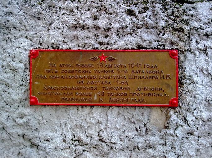 Keywords: Памятная доска на постаменте памятника.jpg ru Памятная доска на постаменте памятника а этом убеже 19 августа 1941 года пять советских танков 1-го батальона под командованием капитана Шпилле а И Б из состава 1-ой К аснознаменной танковой дивизии уничтожили более 40 танков п отивника вавшихся к Ленинг аду own Uchkhoz1 2011-08-01 Cc-zero Novyy Uchkhoz Zinoviy Kolobanov Plaques in Leningrad Oblast Plaques in Russian Plaques referencing 1941 Military plaques