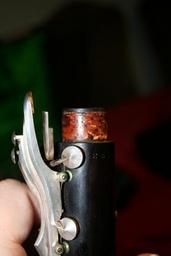 Keywords: penzal müller mueller clarinet a wood vintage depth of field Here we see the upper to lower connector, that connects the tone hole rings from top to bottom. When I first put the horn together this piece was not quite right. The rings on the lower half would not lay flat when pressed. I had to gently bend this guy up so that it was in tolerance. It's not perfect, but the cork padding is gone and once that is replaced there should be no play between the two parts. Here we see the upper to lower connector, that connects the tone hole rings from top to bottom. When I first put the horn together this piece was not quite right. The rings on the lower half would not lay flat when pressed. I had to gently bend this guy up so that it was in tolerance. It's not perfect, but the cork padding is gone and once that is replaced there should be no play between the two parts. |