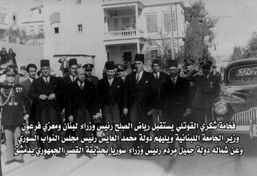 | View Original: | الرئيس شكري القوتلي مستقبلاً دولة الرئيس رياض الصلح في دمشق عام 1948.jpg (720x494) | |||