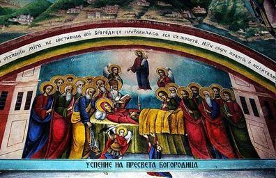 Keywords: Сите Светии Лешани.JPG mk Ф еска со п иказ на упокојувањето на П есвета Бого одица во ц квата во манасти от Си Свети во Лешани Ох идско http //2 bp blogspot com/_AClns1E7Ul4/Spb8xy3SxqI/AAAAAAAAAIk/tUZawilkGsk/s1600-h/uspenie+na+presveta+bogorodica JPG Author century 15 PD-Macedonia All Saints Monastery Frescos in the Republic of Macedonia |