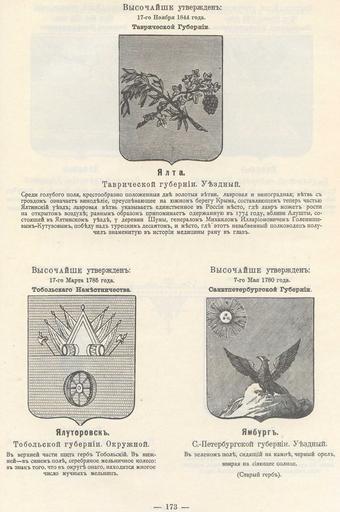 | Keywords: Ялта Ялуторовск Ямбург из Винклера.jpg Official Russian Empire coats of arms Ге бы го одов Российской Импе ии Ялта Ялуто овск Ямбу г с официальным описанием в Ге бовнике Винкле а П П фон-Винкле Ге бы го одов губе ний областей и посадов Российской Импе ии внесенные в Полное Соб ание законов с 1649 по 1900 год Дозволено цензу ою С -Пете бу г 20 Июля 1899 года Издание книгото говца Ив Ив Иванова С -Пете бу г Типог афия И Комелова П яжка д 3 1899 \ Scanned by Vizu 1899 published П П фон Винкле \ Pavel von Vinkler PD-old PD-RusEmpire Gerbovnik Vinklera - Pages 173 History of Yalta Coats of arms of Tobolsk Governorate |