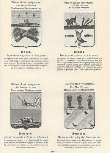 Keywords: Шацк Шемаха Шенкурск Шишкеев из Винклера.jpg Official Russian Empire coats of arms Ге бы го одов Российской Импе ии Шацк Шемаха Шенку ск Шишкеев - с официальными описаниями в Ге бовнике Винкле а П П фон-Винкле Ге бы го одов губе ний областей и посадов Российской Импе ии внесенные в Полное Соб ание законов с 1649 по 1900 год Дозволено цензу ою С -Пете бу г 20 Июля 1899 года Издание книгото говца Ив Ив Иванова С -Пете бу г Типог афия И Комелова П яжка д 3 1899 \ Scanned by Vizu 1899 published П П фон Винкле \ Pavel von Vinkler PD-old PD-RusEmpire PD-RU-exempt coats of arms Gerbovnik Vinklera - Pages 169 Coats of arms of Tambov Governorate Coats of arms of Shamakhi Coats of arms of Baku Governorate Coats of arms of Arkhangelsk Governorate Coats of arms of Penza Governorate