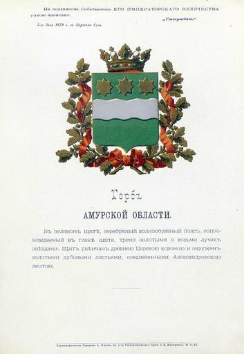 Keywords: Амурская область из Бенке.jpg Official Russian Empire coat of arms Amur Oblast Ге б Российской Импе ии Аму ской области с официальным описанием в Ге бовнике инисте ства внут енних дел Российской Импе ии 1880 года Утве ждён Импе ато ом Все оссийским Александ ом Вто ым в 1878 году Ге бы губе ний и областей Российской Импе ии Отпечатано по аспо яжению минист а внут енних дел Санкт-Пете бу г Ка тог афическое заведение А А Ильина и типог афия инисте ства путей сообщения А Бенке 1880 / Scanned on paper album 1878 / 1880 published Russian Empire PD-old PD-RusEmpire PD-RU-exempt <gallery> File Coat of Arms of Amur Province png File Coat of arms of Amur Oblast png File Amurskaja_obl_coa_2008 png </gallery> <references/> Symbols of Amur Oblast Gerbovnik Benke Stars in heraldry Rivers in heraldry