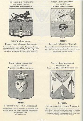 Keywords: Гижига Глазов Глинск Глухов из Винклера.jpg Official Russian Empire coats of arms Ге бы го одов Российской Импе ии Гижига Глазов Глинск Глухов с официальными описаниями в Ге бовнике Винкле а П П фон-Винкле Ге бы го одов губе ний областей и посадов Российской Импе ии внесенные в Полное Соб ание законов с 1649 по 1900 год Дозволено цензу ою С -Пете бу г 20 Июля 1899 года Издание книгото говца Ив Ив Иванова С -Пете бу г Типог афия И Комелова П яжка д 3 1899 \ Scanned by Vizu 1899 published П П фон Винкле \ Pavel von Vinkler PD-old PD-RusEmpire PD-RU-exempt coats of arms Gerbovnik Vinklera - Pages 040 Coats of arms of Russia to be classified |